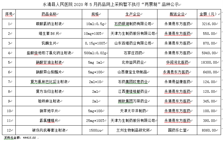 永清县人民医院2020年5月药品网上采购暂不执行“两票制”品种公示